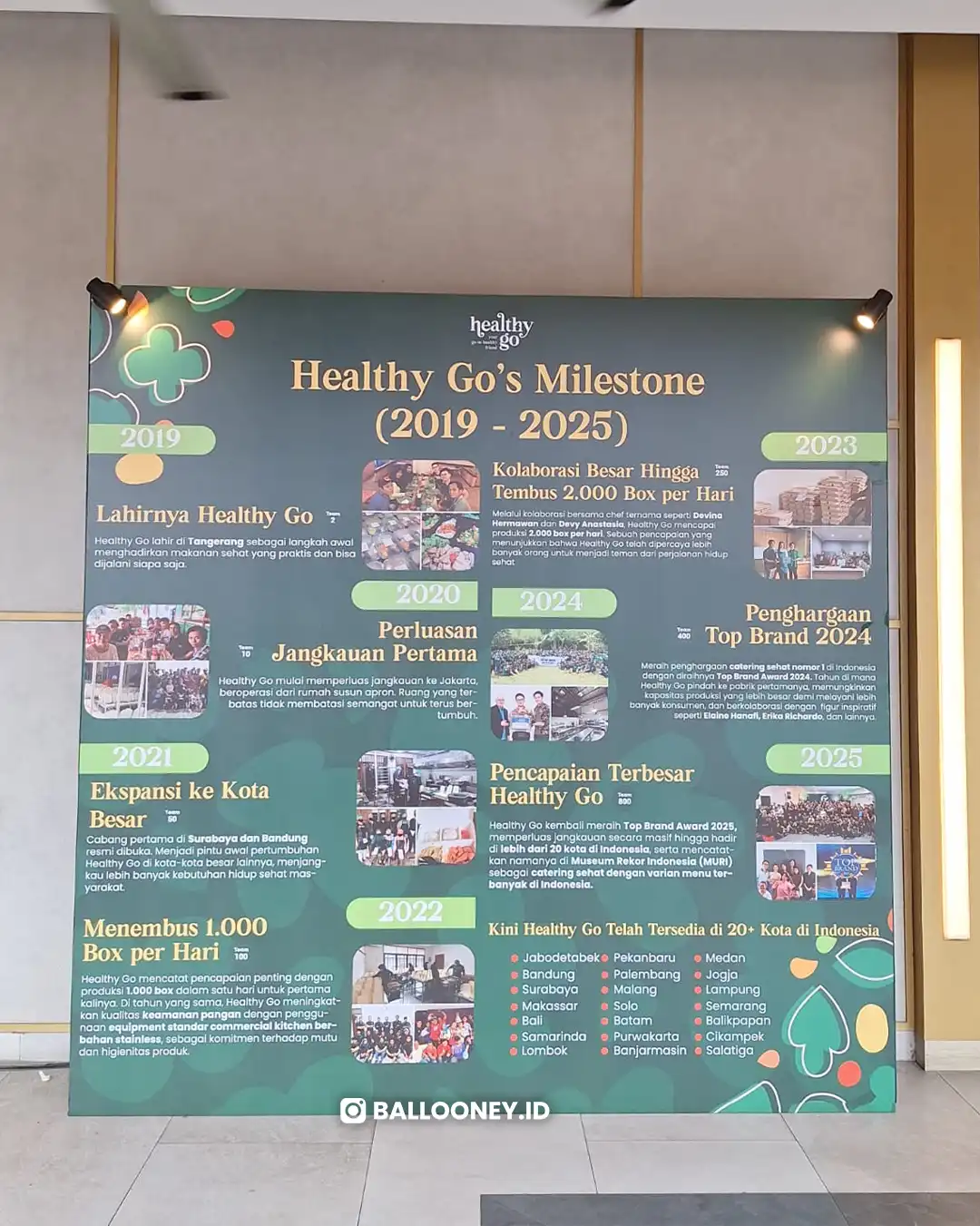 Klien kami juga memesan sebuah backdrop yang berisi tentang kisah perjalanan perusahaan mereka dari awal hingga sekarang ketika mendapatkan penghargaan tersebut. Milestone Wall Backdrop ini bisa menjadi pengingat tentang bagaimana perjuangan tidak menghianati hasil. Nanti anda dan seluruh tim juga bisa menulis nulis pesan hangat di papan ini
