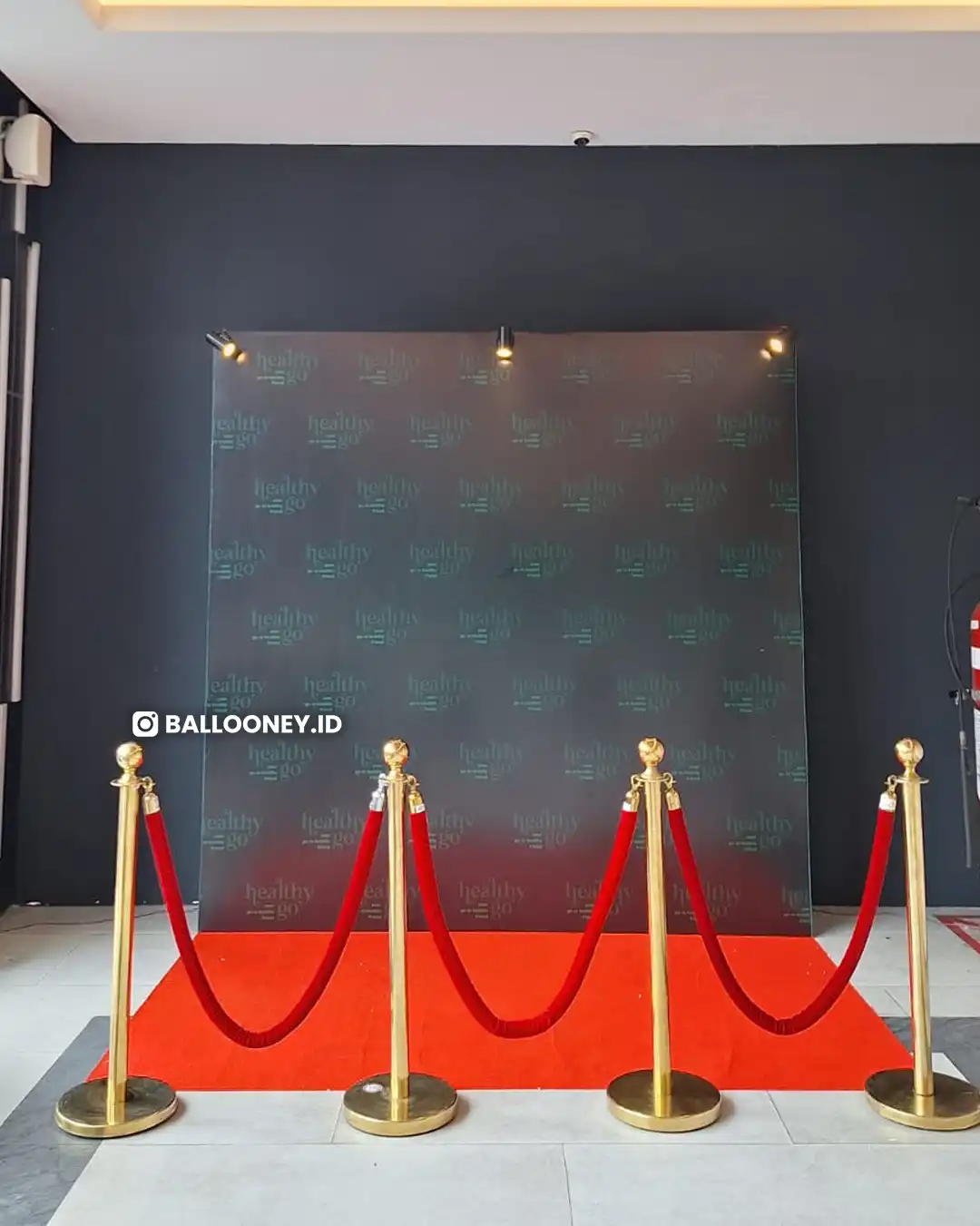 Backdrop dengan logo – logo perusahaan ditemani dengan red carpet menjadi spot foto nya, ditemani dengan tiang antri estetik gold merah untuk melengkapi kesan mewah dari acara ini