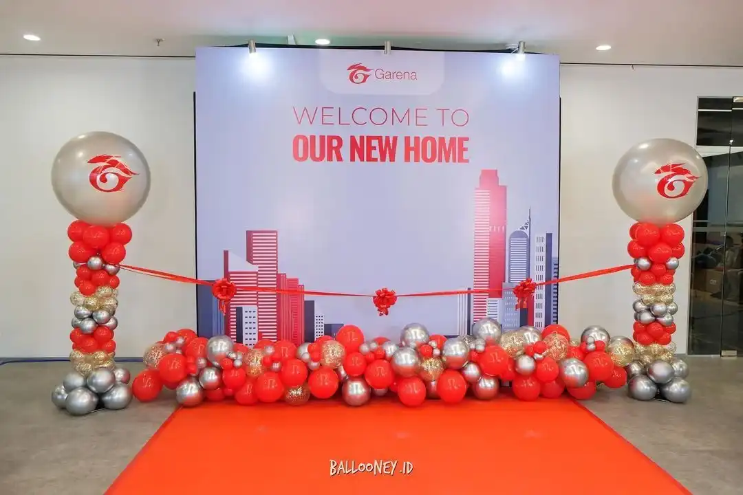 Untuk area dalam ruangan, kami menyediakan backdrop untuk foto bersama kolega dan partner bisnis. Ditambah dengan standing balloon di sudut-sudut ruangan untuk menghidupkan suasana tanpa memakan banyak tempat. Ini contohnya seperti dekorasi yang kami pernah buat untuk kantor baru Garena di Jakarta Pusat